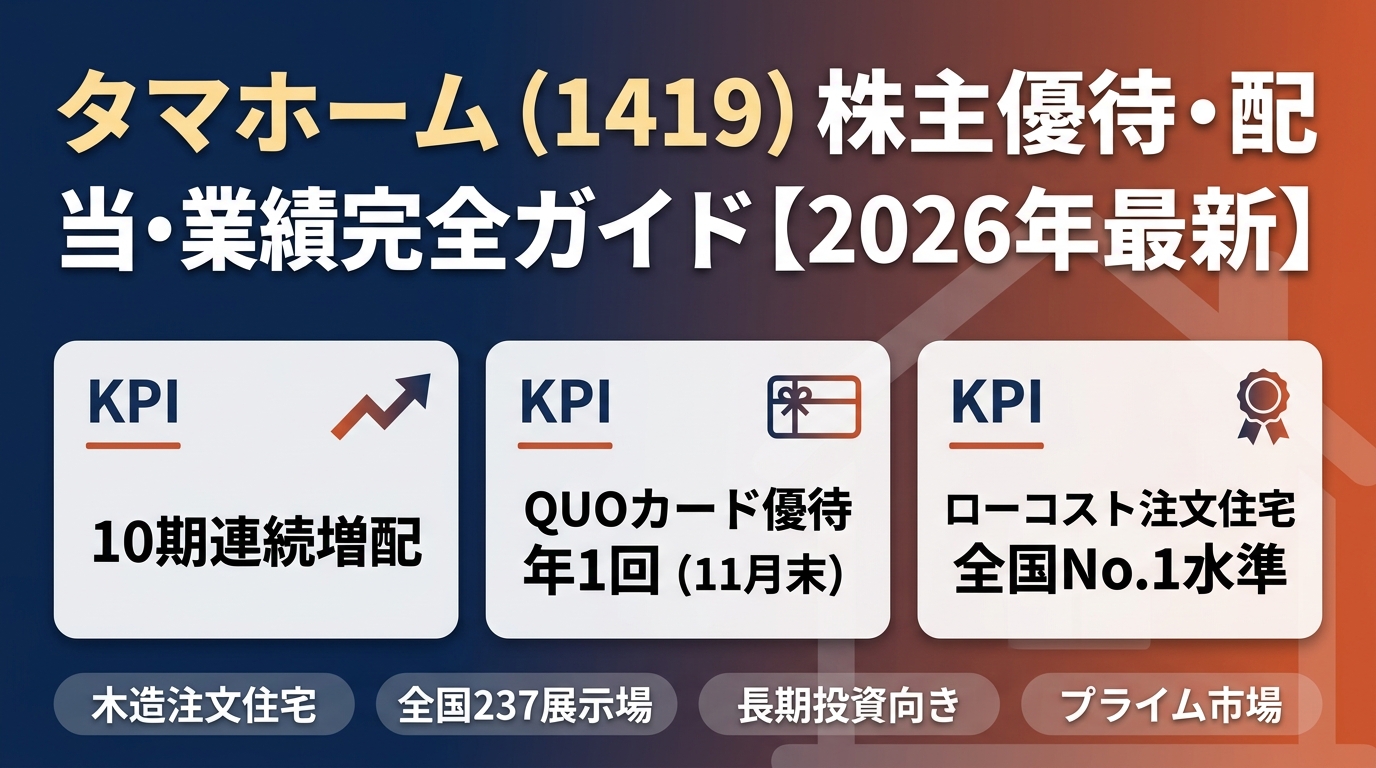 タマホーム(1419)は、ローコスト木造注文住宅で全国的なブランドを持つ建設企業です。最大の魅力は10期連続増配という揺るぎない株主還元姿勢と、約5%という高い配当利回りです。株主優待のQUOカードも年1回11月末の権利確定で年間¥2,000〜¥4,000(3年以上保有で増額)と実用的で、総合利回り約5.5〜6.0%水準を享受できます。