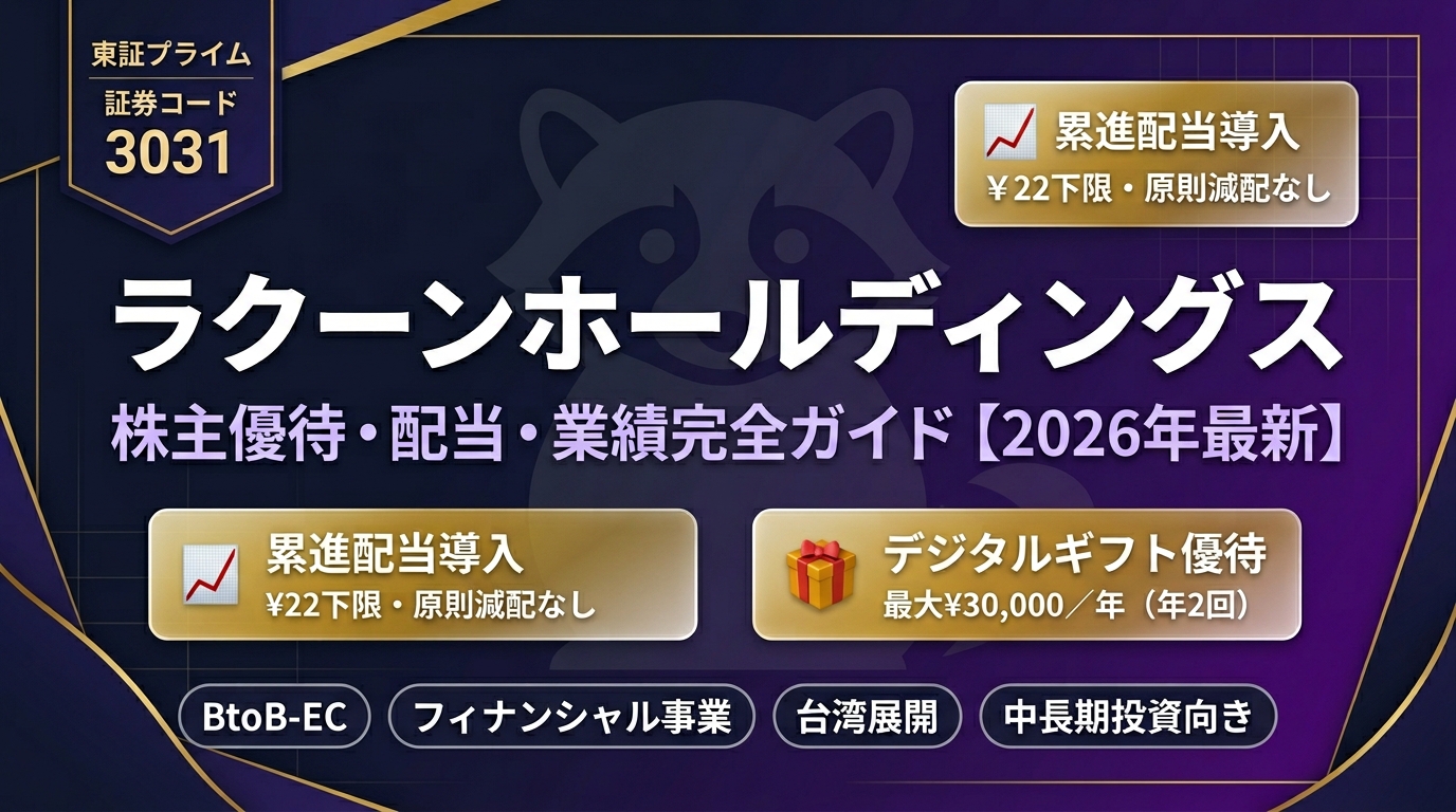 ラクーンホールディングス(3031)は、BtoB-EC「スーパーデリバリー」とフィナンシャル事業(掛け売り決済・売掛保証)の2本柱で安定した高収益(営業利益率20%超)を誇る情報通信企業です。2025年10月に株主優待を新設し、デジタルギフトを年2回最大¥15,000(年間最大¥30,000)進呈。配当4.2%と優待4.6%を合わせた総合利回り約8.8%は、現在の低金利環境下で非常に魅力的な水準です。