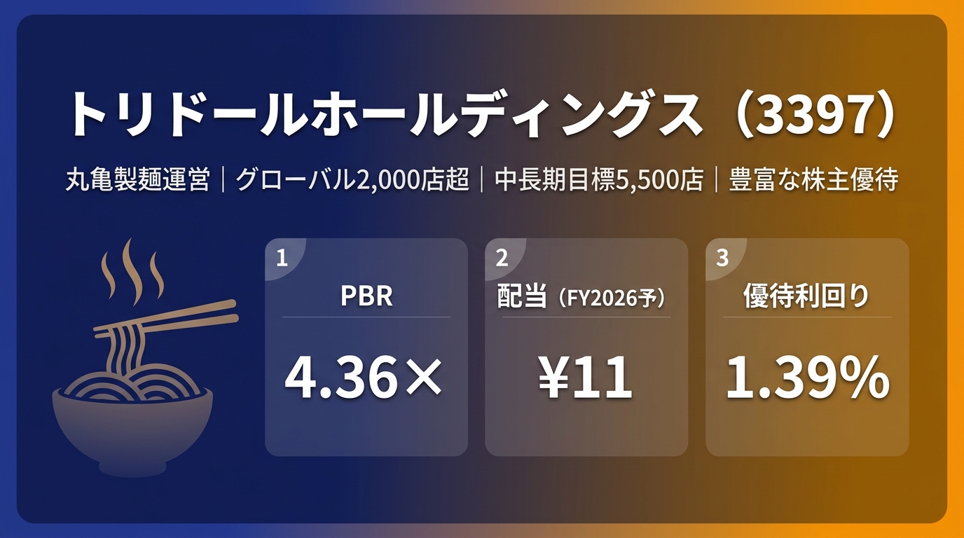 トリドールホールディングス(3397)は、丸亀製麺という強力なブランドとグローバル展開ストーリーを持つ成長型外食株です。FY2025は海外のれん減損等で純利益が大幅縮小しましたが、3Q累計段階で既に通期計画を大幅超過しており、FY2026のV字回復がほぼ確実視されています。