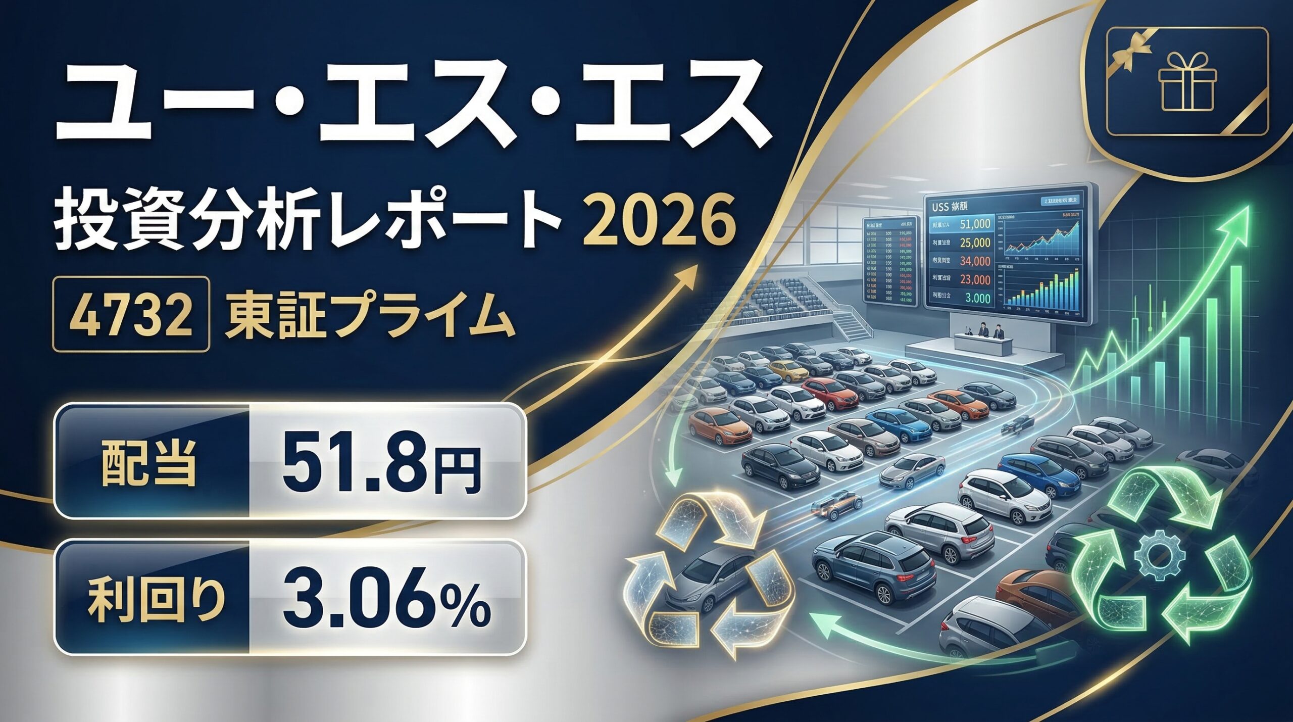 [ユー・エス・エス](https://finance.yahoo.co.jp/quote/4732.T) は、中古車オークション運営で国内最大規模を誇る高収益企業です。2026年3月期第3四半期時点で、売上高829億円、営業利益438億円と増収増益を確保し、通期予想も上方修正済みです。自己資本比率76.2%という強固な財務に加え、2025年度から連結配当性向60%以上、さらに2026年3月期から2028年3月期までの3か年は総還元性向100%以上という強い株主還元方針を掲げており、配当と優待の両面から個人投資家にも評価されやすい銘柄です。 [Source](https://finance.yahoo.co.jp/quote/4732.T) [Source](https://www.ussnet.co.jp/ir/management/vision/index.html) [Source](https://www.ussnet.co.jp/ir/stock/dividend/)