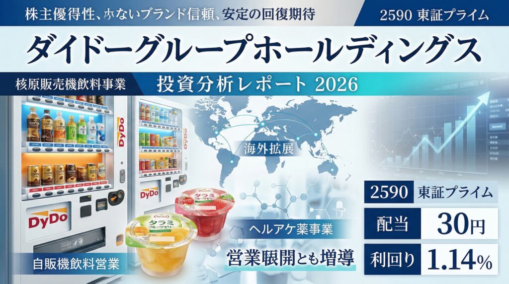 ダイドーグループホールディングス(2590)投資分析レポート 東証プライム / 食料品 ダイドーグループホールディングス(2590)投資分析レポート 自販機飲料の再成長と、海外飲料・医薬・食品の多角化をどう評価するか 株価 2,621円 時価総額 約869億円 予... -