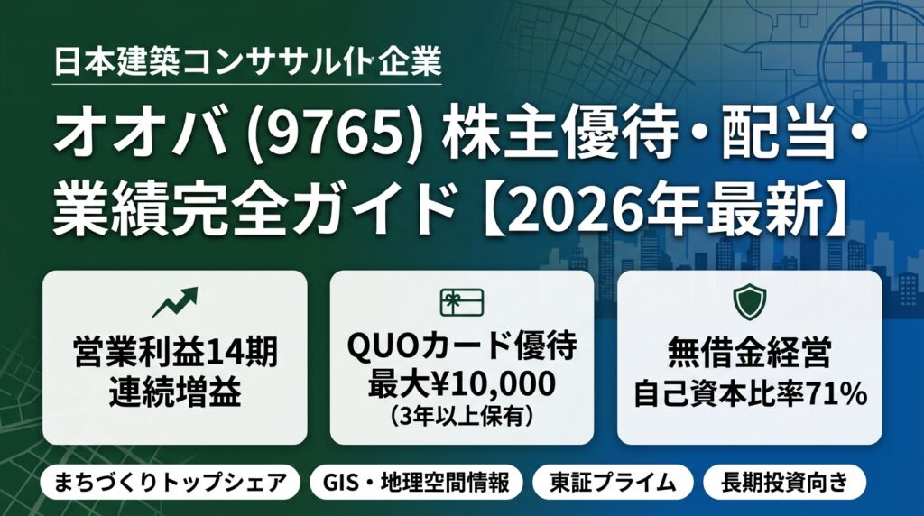オオバ(9765)株主優待・配当・業績完全ガイド【2026年最新】 🏙️ 東証プライム上場 | 証券コード:9765 オオバ(9765)株主優待・配当・業績完全ガイド 【2026年最新】総合建設コンサルタント | 創業78年 | 営業利益14期連続増益 | データ基準日:2026年3...