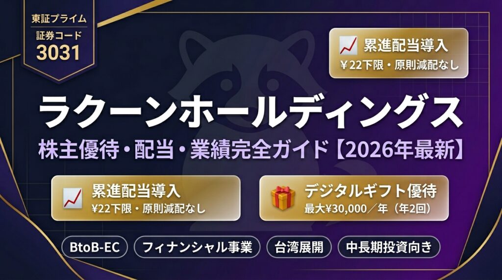 ラクーンホールディングス(3031)株主優待・配当・業績完全ガイド【2026年最新】 🦝 東証 Prime / 証券コード 3031 ラクーンホールディングス(3031)株主優待・配当・業績完全ガイド 【2026年最新版】デジタルギフト最大¥15,000×年2回 / 高配当利回り4... -