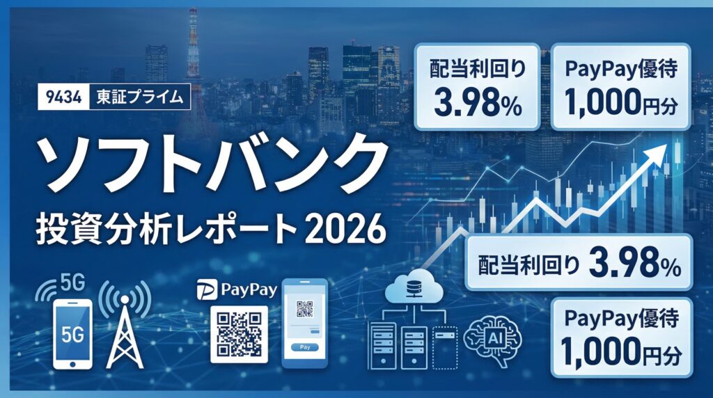 ソフトバンク(9434)投資分析レポート 2026 東証プライム / 高配当・通信・PayPay・AI計算基盤 ソフトバンク(9434)投資分析レポート 国内通信の安定収益を土台に、PayPay・法人DX・AI計算基盤へ広げるソフトバンク。約4%の配当利回りと1,000円分のPayPa... -