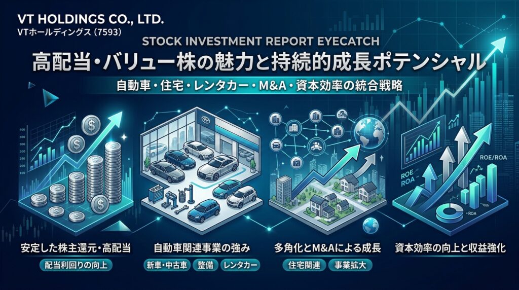 VTホールディングス(7593)投資分析レポート 2026 東証プライム 7593 VTホールディングス(7593)投資分析レポート 2026 自動車ディーラー・中古車・サービス・レンタカー・住宅を束ねる持株会社。高配当とPBR1倍割れを背景に、M&Aと資本効率改善の両... -