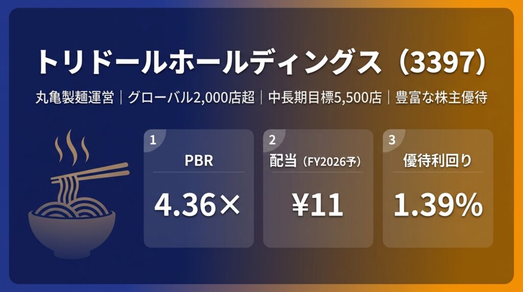 トリドールホールディングス(3397)投資分析レポート 証券コード 3397 | 東証プライム | IFRS採用 トリドールホールディングス(3397)投資分析レポート 丸亀製麺を中核にグローバル展開|優待食事割引カード|中長期5,500店目標 株価(03/13) ¥4,294 ... -