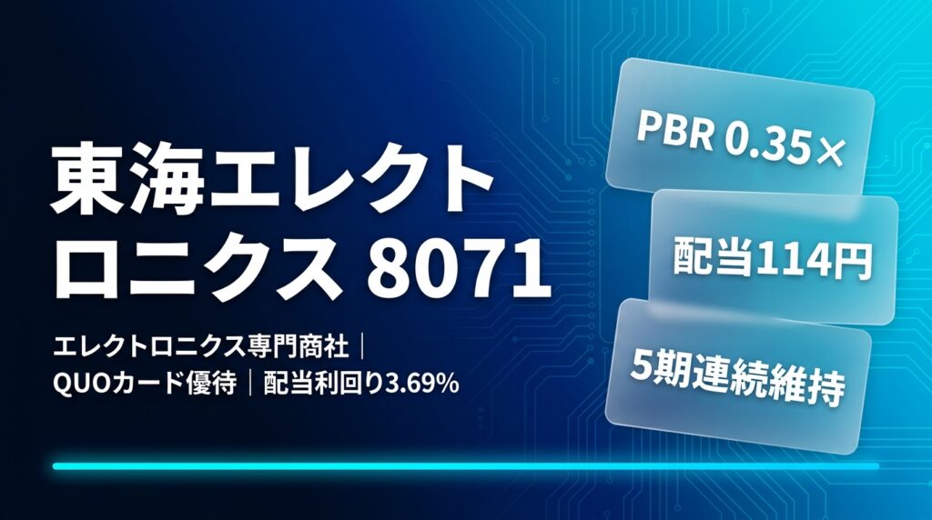 東海エレクトロニクス(8071)株主優待・配当・業績完全ガイド 2026年版 名証メイン上場 ・ 証券コード 8071 東海エレクトロニクス(8071)株主優待・配当・業績完全ガイド 2026年版 エレクトロニクス専門商社の老舗 | QUOカード優待 | 配当利回り約3.7%... -