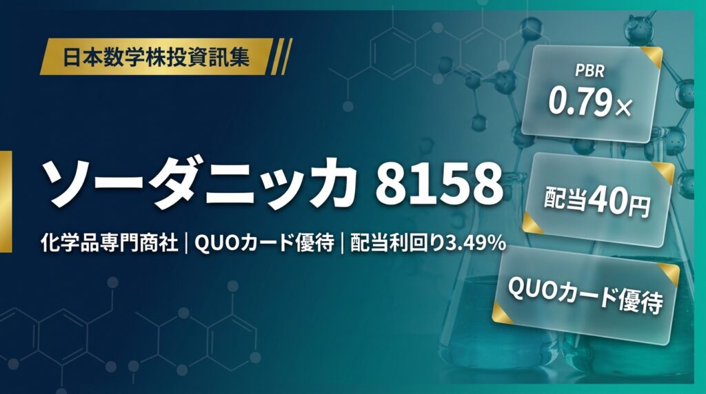 ソーダニッカ(8158)株主優待・配当・業績完全ガイド 東証スタンダード ・ 証券コード 8158 ソーダニッカ(8158)株主優待・配当・業績完全ガイド 2026年版 化学品専門商社の老舗 | QUOカード優待 | 配当利回り約3.5% 株価(2026/03/06) ¥1,144 東証ス...