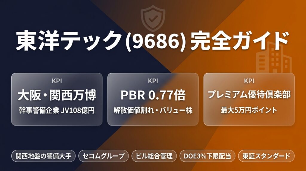 東洋テック(9686)株主優待・配当・業績完全ガイド【2026年最新】 🔒 東証スタンダード上場 | 証券コード:9686 東洋テック(9686)株主優待・配当・業績完全ガイド 【2026年最新】警備×ビル管理×不動産 | セコムグループ | 大阪・関西万博幹事警備企業 |... -
